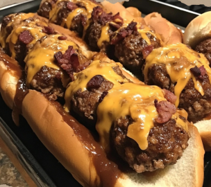Indulge in this flavorful fusion of smoky meatballs, crispy bacon, tangy BBQ sauce, and gooey cheddar cheese, all nestled in a warm, toasted sub roll. Perfect for dinner or game-day snacks!