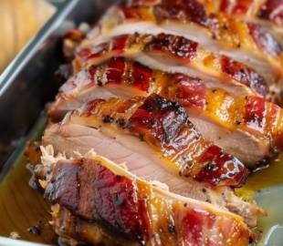 - Wrap the seasoned tenderloin with the bacon slices, securing with toothpicks if needed.