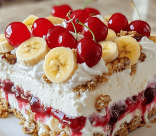 Top the dessert with the cherry pie filling, ensuring it’s evenly distributed. Sprinkle the chopped nuts over the top. Drizzle chocolate syrup over the entire dessert and garnish with maraschino cherries.