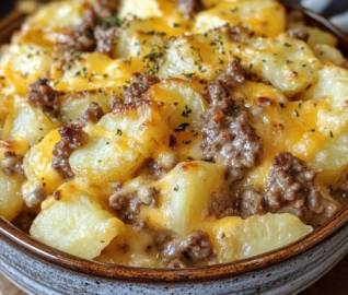 Pour the beef mixture over the potatoes and spread evenly.