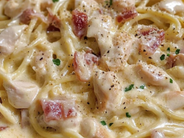 This rich and flavorful pasta dish combines tender chicken, crispy bacon, and a luxuriously creamy sauce, all tossed with perfectly cooked spaghetti. It’s the kind of meal that feels like a warm hug in a bowl, making it perfect for both special occasions and weeknight dinners.