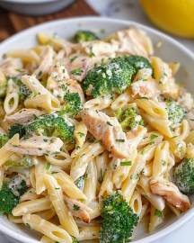 Add the cooked pasta, broccoli, and chicken back into the skillet. Toss everything together until evenly coated with the creamy sauce. Adjust seasoning with more salt and pepper, if needed. - Serve: