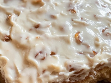 While the cake is cooling, prepare the topping. In a medium-sized bowl, beat the softened cream cheese and unsalted butter together until smooth and creamy. Gradually add the powdered sugar and continue beating until the mixture is light and fluffy. Stir in the vanilla extract, followed by the chopped pecans or walnuts. This topping is rich, creamy, and adds the perfect touch of sweetness and crunch to the cake.