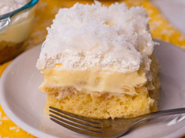 The base of this recipe is a simple yellow cake mix, but the final result is anything but ordinary. Prepare the cake according to the box directions and bake it in a 9×13-inch pan. While the cake is baking, whip up the pudding layer with cream cheese, vanilla pudding mix, and whole milk. Once it’s smooth, chill it in the fridge while the cake cools.