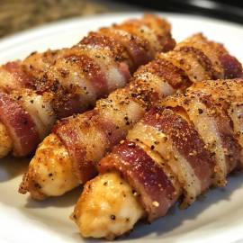 Wrap each seasoned chicken tender with a slice of cooked bacon, securing it with toothpicks if needed. Place them on the prepared baking sheet seam side down.