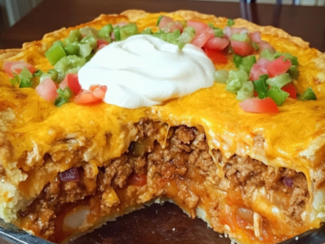 With a flaky crescent roll crust, seasoned ground beef, creamy sour cream, and melted cheese, all topped with crunchy tortilla chips, this dish brings the essence of a taco to your dinner table in a pie form. It’s quick to make, crowd-pleasing, and perfect for a family meal or a casual get-together.